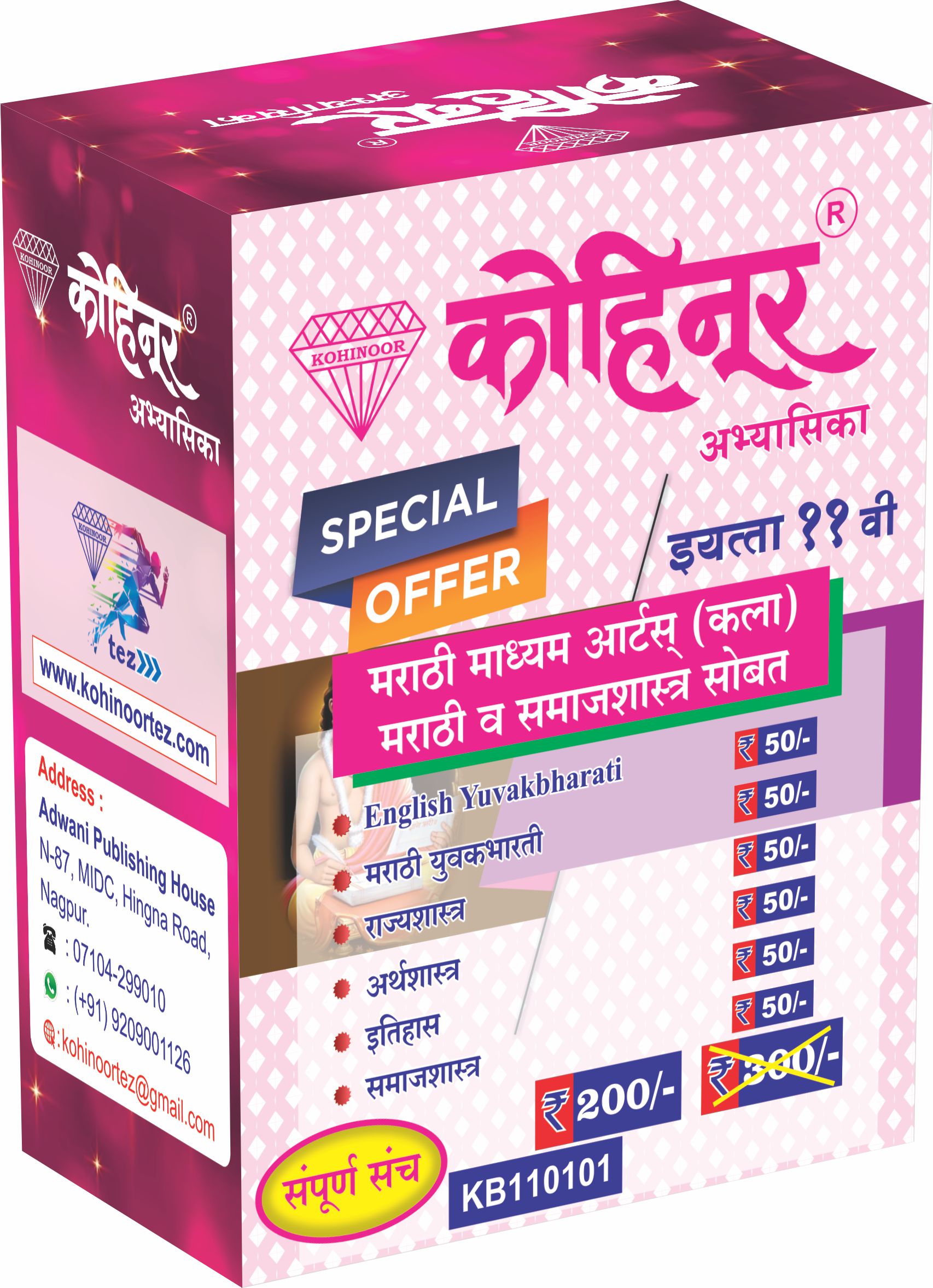 कोहिनूर अभ्यासिका इयत्ता 11 वी मराठी माध्यम आर्टस् (कला) संच महाराष्ट्र राज्य मंडळाच्या अभ्यासक्रमावर आधारित आहे. या संपूर्ण संचामध्ये इंग्रजी युवकभारती, मराठी युवकभारती, राज्यशास्त्र, अर्थशास्त्र, इतिहास आणि समाजशास्त्र हे सर्व आवश्यक विषय समाविष्ट आहेत. कला शाखेतील विद्यार्थ्यांना संतुलित व सखोल अभ्यासासाठी हा संच उपयुक्त ठरतो.