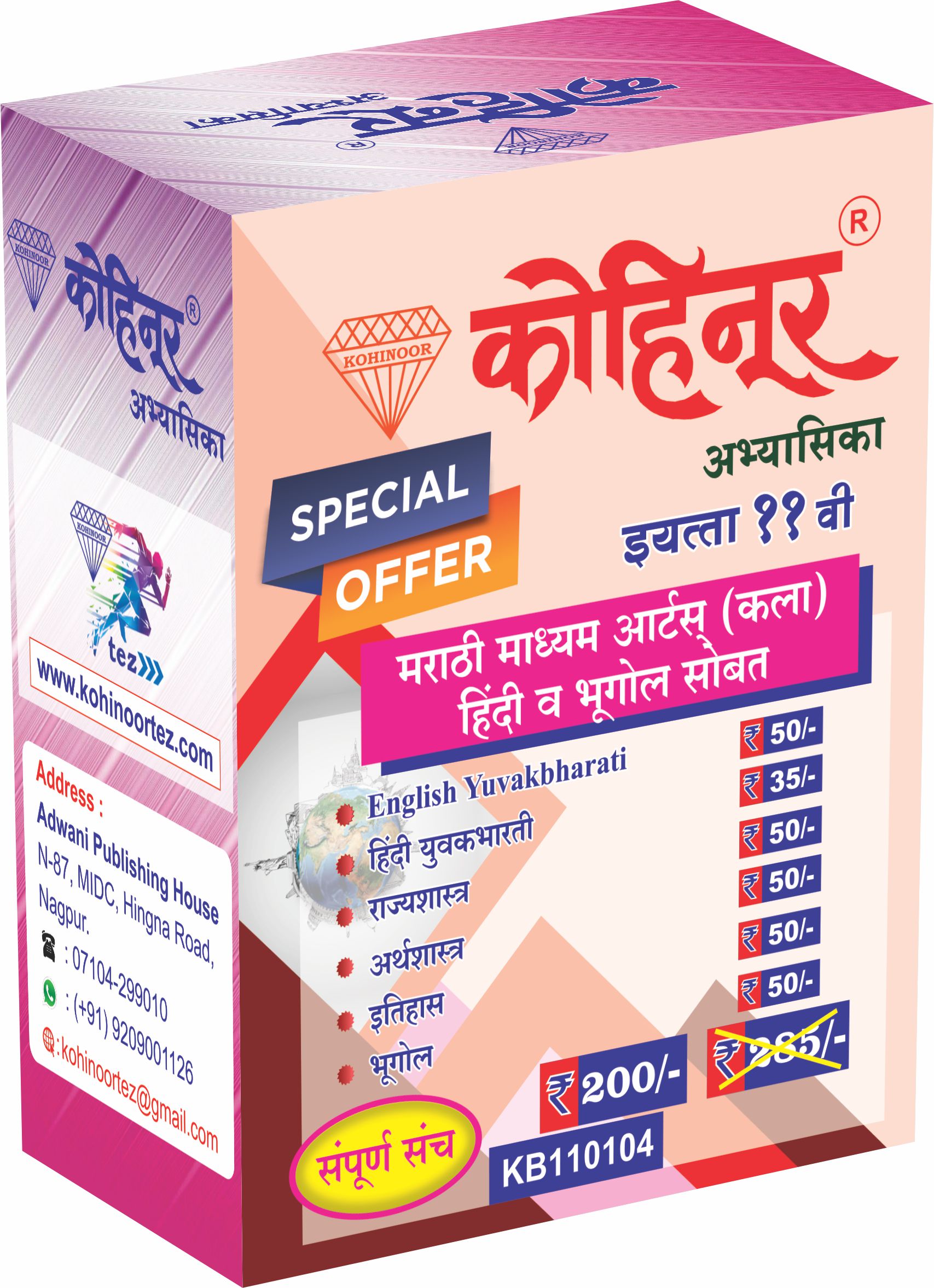 ही कोहिनूर अभ्यासिका संच महाराष्ट्र राज्य मंडळाच्या ११वी इयत्तेच्या कला शाखेतील विद्यार्थ्यांसाठी तयार करण्यात आलेली आहे. हा संच मराठी माध्यमातून शिकणाऱ्या त्या विद्यार्थ्यांसाठी आहे ज्यांनी पर्यायी विषय म्हणून हिंदी आणि भूगोल निवडले आहे. या संपूर्ण सेटमध्ये सहा महत्त्वाच्या विषयांच्या अभ्यासिका समाविष्ट आहेत जे कला शाखेच्या अभ्यासासाठी आवश्यक आहेत.