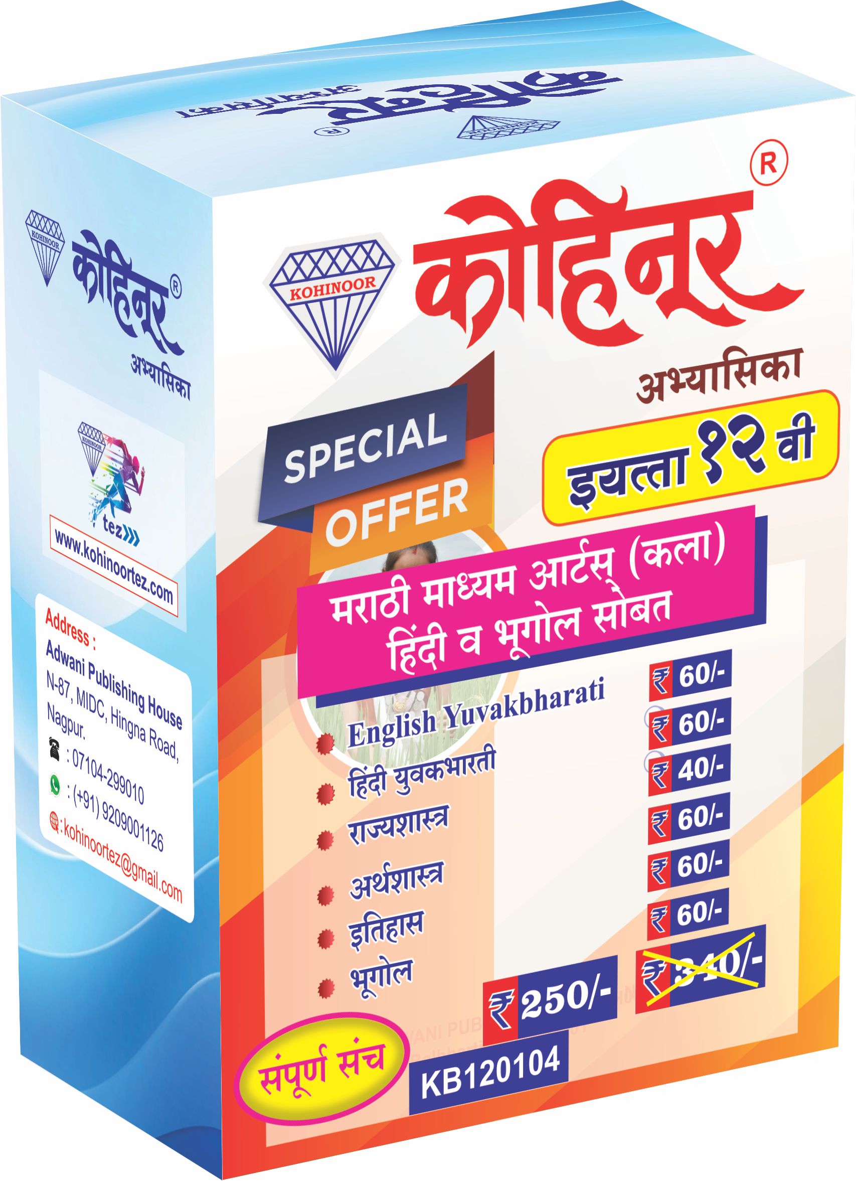 ही कोहिनूर अभ्यासिका संच महाराष्ट्र राज्य मंडळाच्या १२वी इयत्तेच्या कला शाखेतील विद्यार्थ्यांसाठी तयार करण्यात आलेली आहे. हा संपूर्ण संच मराठी माध्यमातून शिकणाऱ्या त्या विद्यार्थ्यांसाठी आहे ज्यांनी पर्यायी विषय म्हणून हिंदी आणि भूगोल निवडले आहे. या सेटमध्ये एकूण सहा महत्त्वाच्या विषयांच्या अभ्यासिका समाविष्ट आहेत जे HSC बोर्ड परीक्षेसाठी आवश्यक आहेत.