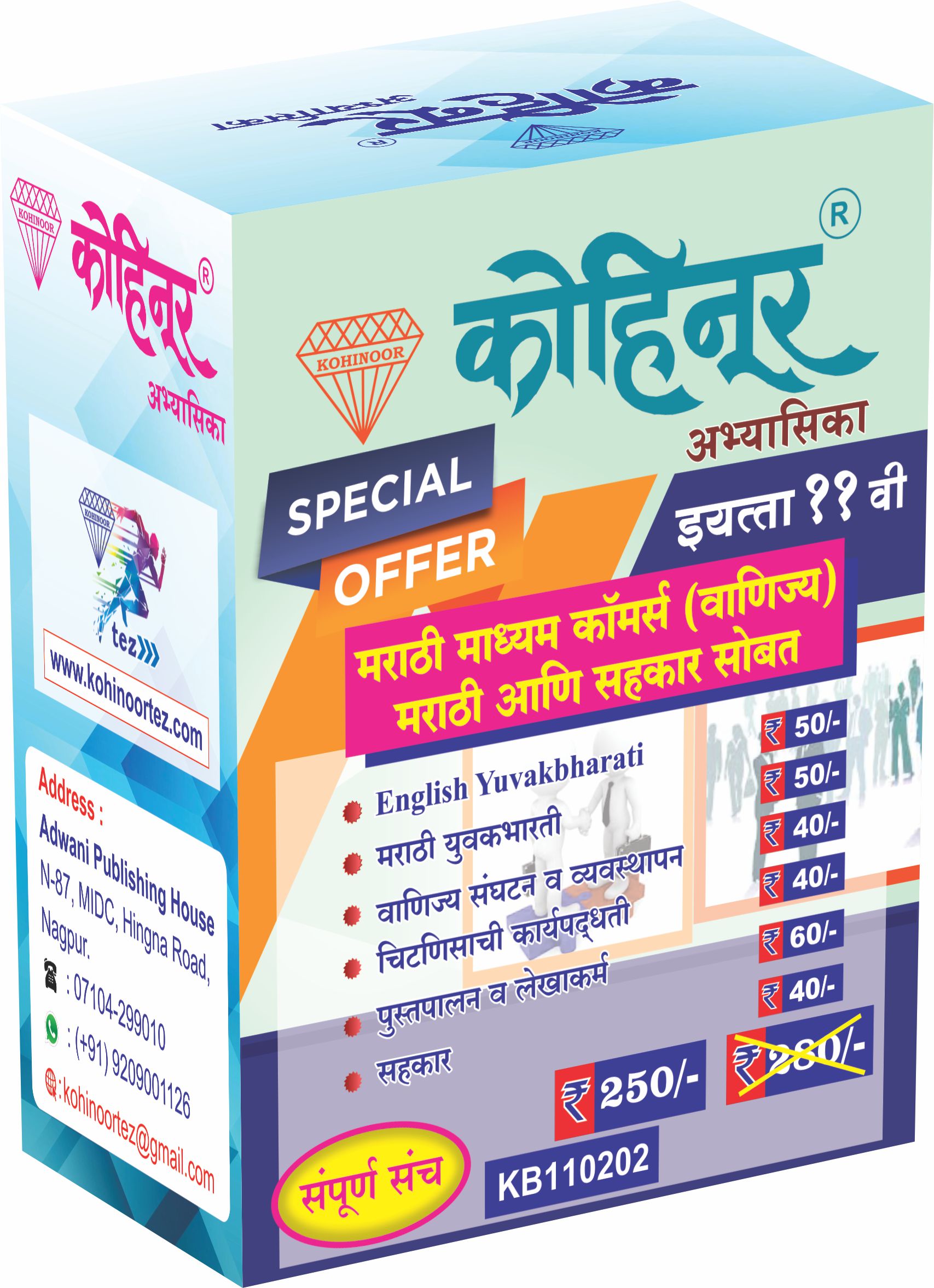 कोहिनूर अभ्यासिका इयत्ता 11 वी मराठी माध्यम कॉमर्स (वाणिज्य) संच महाराष्ट्र राज्य मंडळाच्या अभ्यासक्रमावर आधारित आहे. या संपूर्ण संचामध्ये इंग्रजी युवकभारती, मराठी युवकभारती, वाणिज्य संघटन व व्यवस्थापन, चिटणीसाची कार्यपद्धती, पुस्तपालन व लेखांकन आणि सहकार हे सर्व महत्त्वाचे विषय समाविष्ट आहेत. हा संच विद्यार्थ्यांना कॉमर्स विषयाची भक्कम पायाभरणी करण्यासाठी उपयुक्त ठरतो.