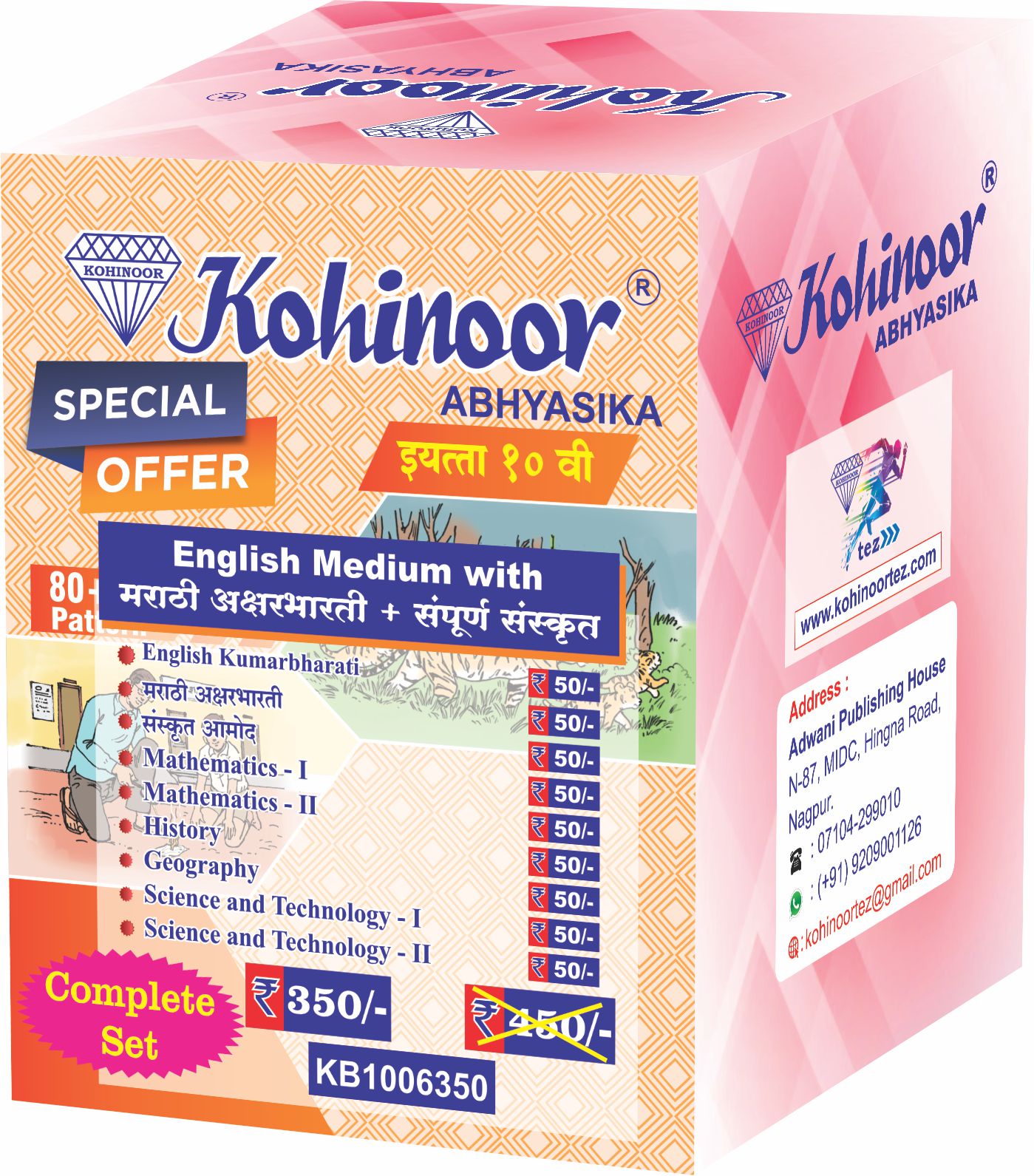 Kohinoor Abhyasika Standard 10 English Medium set is created to give students a balanced learning experience across languages and core subjects. This package brings together English, Marathi Aksharbharti, and Complete Sanskrit along with Mathematics, Science, History, and Geography, helping students study all subjects in a coordinated way under one syllabus.